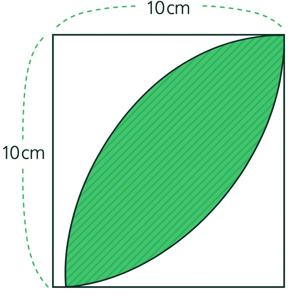 図の赤い部分は、半径が正方形の一辺と同じ円を2つ描いたときの重なり(レンズ形)です。